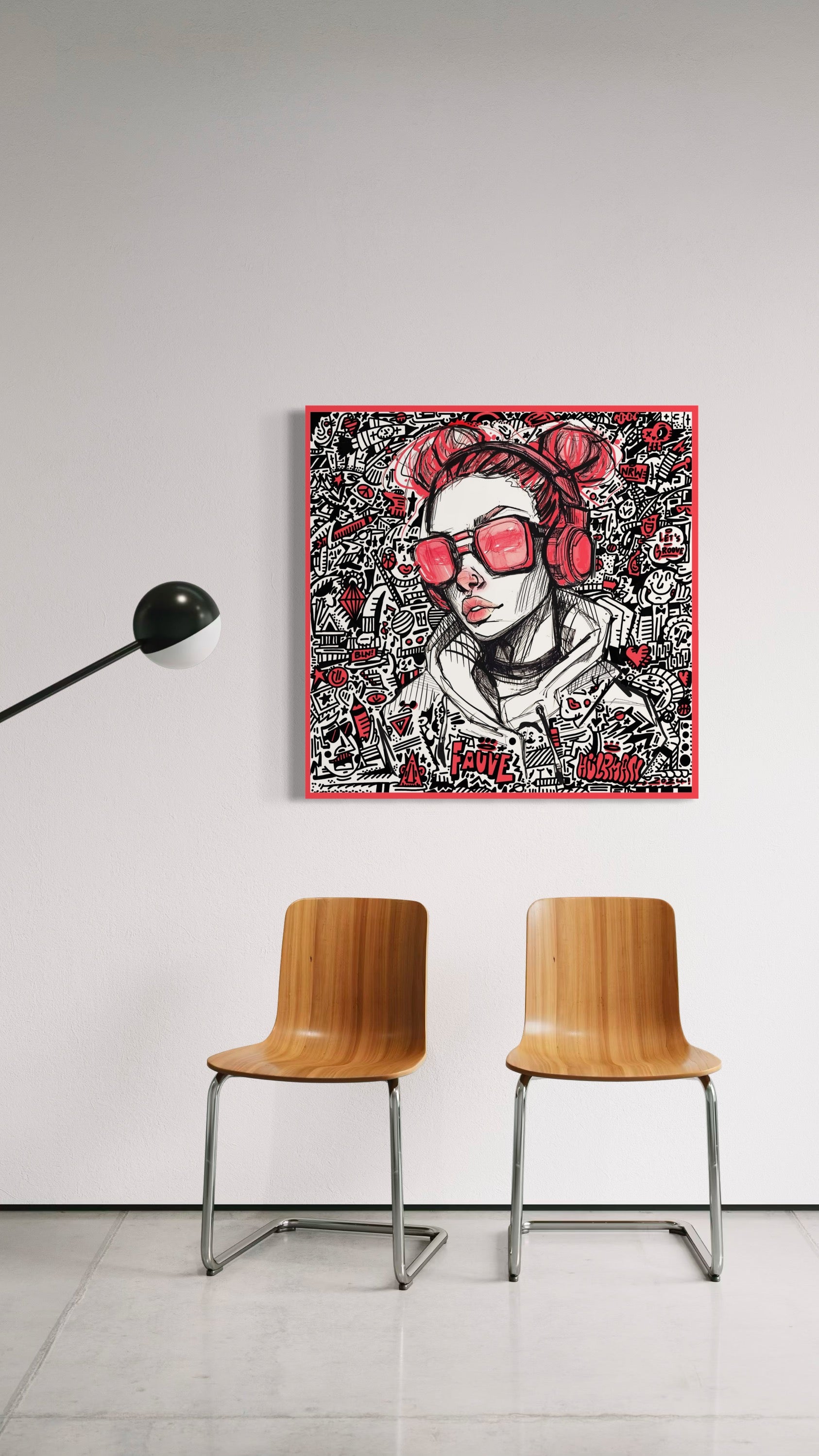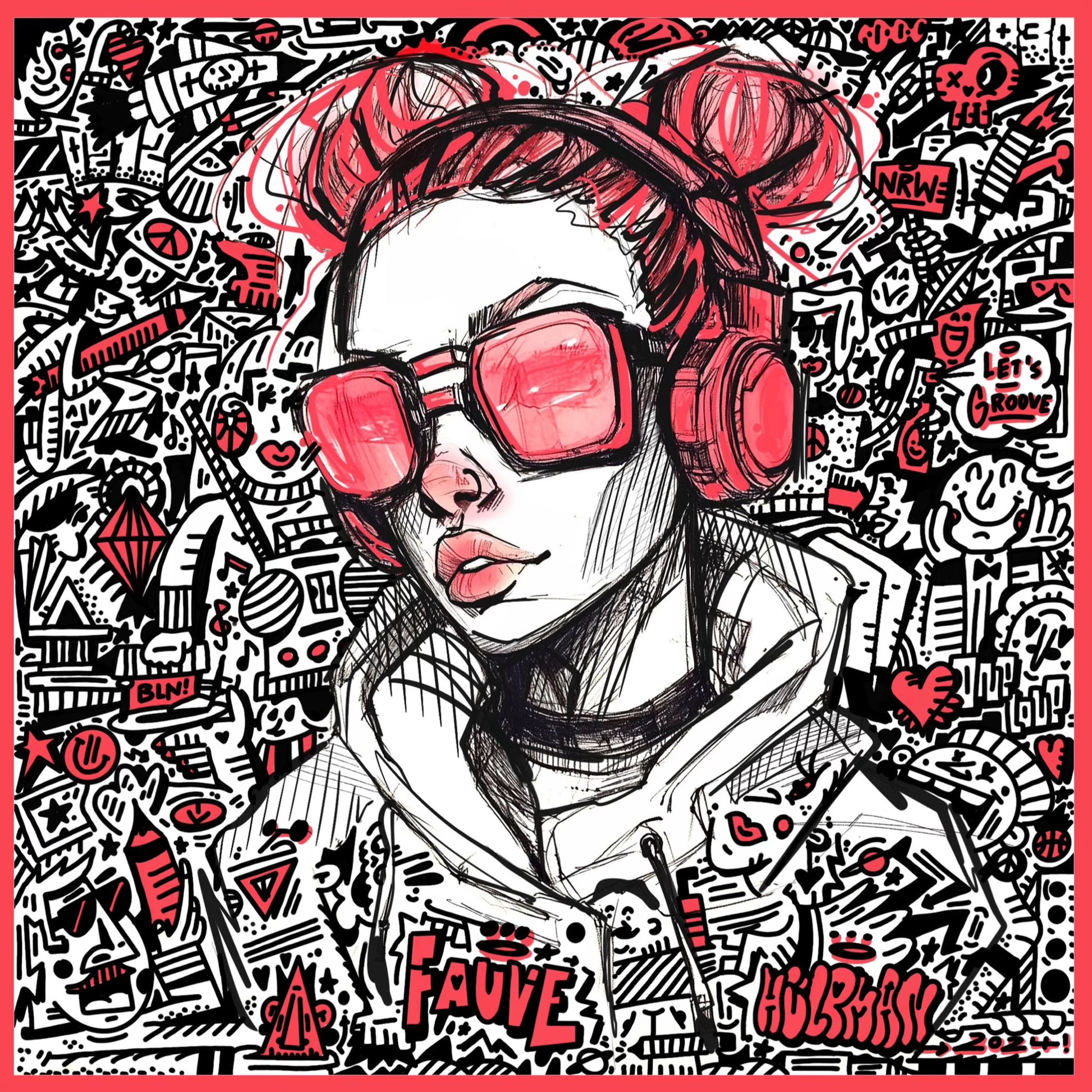 Das Herzstück des Werks: Eine selbstbewusste Protagonistin mit roten Kopfhörern und ikonischer Brille, die sich durch die expressive Szenerie bewegt – umgeben von einem Meer aus Detailverliebtheit, Symbolik und vibrierendem Chaos. Jedes Element erzählt eine Geschichte, jede Linie pulsiert mit Groove.
